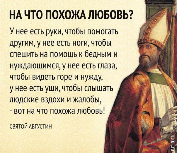 На что похожа любовь? У неё есть руки, чтобы помогать другим, у неё есть ноги, чтобы спешить на помощь к бедным и нуждающимся, у неё есть глаза, чтобы видеть горе и нужду, у неё есть уши, чтобы слышать людские вздохи и жалобы, - вот на что похожа любовь! св. Августин