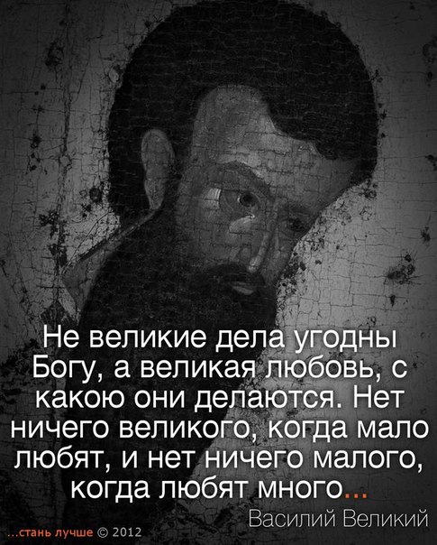 Не великие дела угодны Богу, а великая любовь, с какою они делаются. Нет ничего великого, когда мало любят, и нет ничего малого, когда любят много... Василий Великий