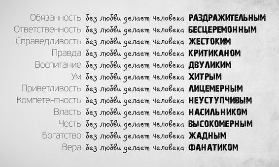 Обязанность без любви делает человека РАЗДРАЖИТЕЛЬНЫМ Ответственность без любви делает человека БЕСЦЕРЕМОННЫМ Справедливость без любви делает человека ЖЕСТОКИМ Правда без любви делает человека КРИТИКАНОМ Воспитание без любви делает человека ДВУЛИКИМ Ум без любви делает человека ХИТРЫМ Приветливость без любви делает человека ЛИЦЕМЕРНЫМ Компетентность без любви делает человека НЕУСТУПЧИВЫМ Власть без любви делает человека НАСИЛЬНИКОМ Честь без любви делает человека ВЫСОКОМЕРНЫМ Богатство без любви делает человека ЖАДНЫМ Вера без любви делает человека ФАНАТИКОМ