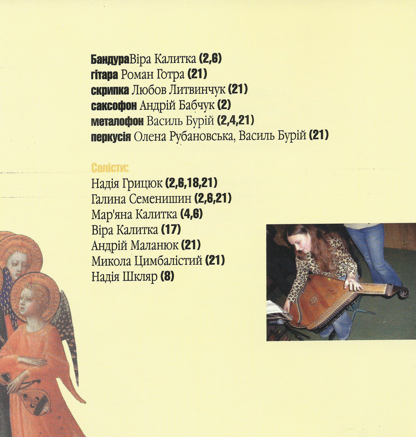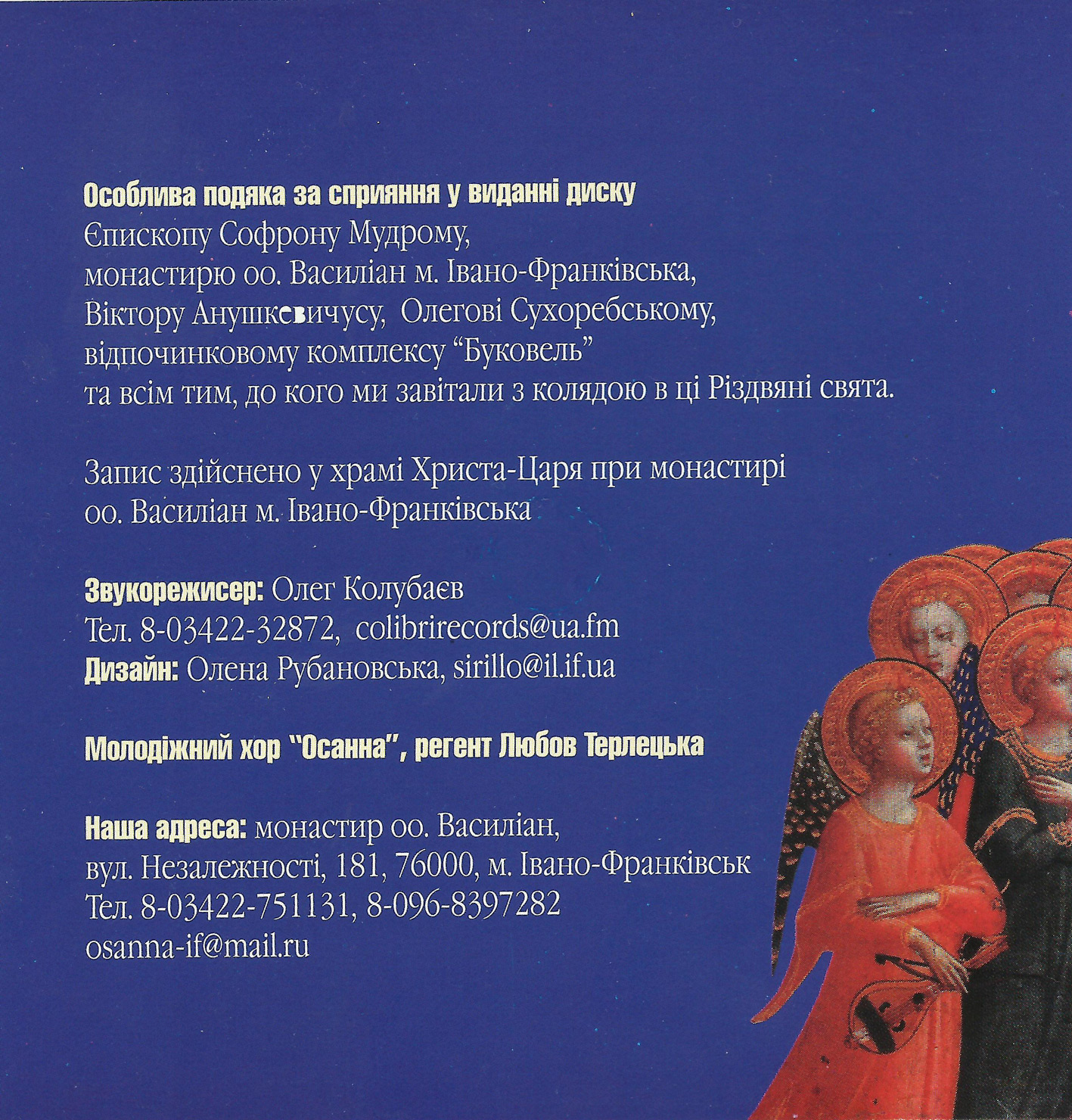 1. Все в нас сьогодні (flac, 4 Мб) 2. Свята ніч (flac, 26 Мб) 3. 7.01 (flac, 3 Мб) 4. Зійшла зоря над Вифлеємом (flac, 18 Мб) 5. 7.01 (продовження) (flac, 5 Мб) 6. Різдвяна (flac, 10 Мб) 7. 7.01 (продовження-закінчення) (flac, 3 Мб) 8. Спи, Ісусе, спи (flac, 16 Мб) 9. Що то за предиво (flac, 12 Мб) 10. Різдвяний вечір в горах (flac, 2 Мб) 11. На свят вечір (flac, 12 Мб) 12. Добрий вечір тобі (flac, 13 Мб) 13. Небо і земля (flac, 13 Мб) 14. Народні віншування (flac, 3 Мб) 15. На небі зірка (flac, 10 Мб) 16. Рождество Христове (flac, 12 Мб) 17. Ой на ріці, на Йордані (flac, 10 Мб) 18. Щедрівки (flac, 13 Мб) 19. Будьте здорові (flac, 7 Мб) 20. Gloria In Excelsis (flac, 1 Мб) 21. Різдво-коляда (flac, 19 Мб)