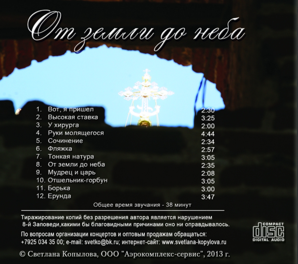 01. Вот, я пришел (mp3 - 0,0 Мб) 02. Высокая ставка (mp3 - 0,0 Мб) 03. У хирурга (mp3 - 0,0 Мб) 04. Руки молящегося (mp3 - 0,0 Мб) 05. Сочинение (mp3 - 0,0 Мб) 06. Фляжка (mp3 - 2,0 Мб) 07. Тонкая натура (пока недоступно) 08. От земли до неба (mp3 - 2,4 Мб) 09. Мудрец и царь (mp3 - 2,0 Мб) 10. Отшельник-горбун (mp3 - 2,9 Мб) 11. Борька (mp3 - 2,8 Мб) 12. Ерунда (mp3 - 3,6 Мб) Компакт-диск Светлана Копылова "От земли до неба" (Песни-притчи) Издательство: ООО "Аэрокомплекс-сервис" Время звучания 38 мин. Светлана Копылова — стихи, музыка, исполнение (кроме 1, 6 - стихи - Мишель Лазарев, 10 - стихи - Анна Санина-Царькова, 11 - стихи - Олег Дмитриев, 12 - стихи - Мария Семенова) Юрий Катешев — звук, аранжировки (студия Василия Богатырева «COSMOSSTUDIO») Фото - Ольга Попова Источник: http://www.svetlana-kopylova.ru/ Поддерживайте создателей христианской музыки - покупайте лицензионные диски. Ищите в продаже в интернет магазинах.