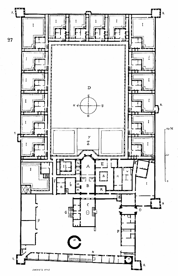 The name Carthusian is derived from the Chartreuse Mountains in the French Prealps: Bruno built his first hermitage in a valley of these mountains. These names were adapted to the English charterhouse, meaning a Carthusian monastery. Today, there are 23 charterhouses, 18 for monks and 5 for nuns. The alcoholic cordial Chartreuse has been produced by the monks of Grande Chartreuse since 1737, which gave rise to the name of the color, though the liqueur is in fact produced not only as green chartreuse, but also as yellow chartreuse. In Italy the Carthusians are known as Certosini and their monastery as a Certosa. HistoryPainting by Sebastiano Ricci (1659–1734) depicting the founder of the Carthusians, Bruno of Cologne (c. 1030-1101), revering Mary, mother of Jesus and adoring the Christ Child, with Hugh of Lincoln (1135–1200) looking on in the background. In 1084 Bishop Hugh of Grenoble offered Bruno, the former Chancellor of the Diocese of Reims, a solitary site in the mountains of his diocese, in the valley of Chartreuse. There Bruno and six companions built a hermitage, consisting of a few wooden cabins opening towards a gallery that allowed them access to the communal areas, the church, refectory, and chapter room without having to suffer too much from inclement conditions. Six years later, Bruno's former pupil, Pope Urban II, requested his services. Bruno would only live in Rome for a few short months however, before leaving to establish a new hermitage in Serra San Bruno, in Calabria, a region of southern Italy. He died there on 6 October 1101. In 1132, an avalanche destroyed the first hermitage, killing 7 monks under the snow. The fifth prior of Chartreuse, Guiges, rebuilt the hermitage. Carthusians in BritainThere were ten Carthusian monasteries in Britain before the Reformation, with one in Scotland and nine in England. The first was founded by Henry II of England in 1181 at Witham Friary, Somerset as penance for the murder of Thomas Becket. Hugh of Lincoln was its first prior. The third Charterhouse built in Britain was Beauvale Priory, remains of which can still be seen in Beauvale, Greasley, Nottinghamshire. The Carthusians, as with all Catholic religious orders, were variously persecuted and banned during the Reformation. The abolition of their priories, which were sources of charity in England, particularly reduced their numbers. This was followed by the French Revolution which had a similar effect in France. A few fragments remain of the Charterhouse in Coventry, mostly dating from the 15th century, and consisting of a sandstone building that was probably the prior's house. The area, about a mile from the centre of the city, is a conservation area, but the buildings are in use as part of a local college. Inside the building is a medieval wall painting, alongside many carvings and wooden beams. Nearby is the river Sherbourne that runs underneath the centre of the city. The best preserved remains of a medieval Charterhouse in the UK are at Mount Grace Priory near Osmotherley, North Yorkshire. One of the cells has been reconstructed to illustrate how different the lay-out is from monasteries of most other Christian orders, which are normally designed with communal living in mind. The London Charterhouse gave its name to Charterhouse Square and several streets in the City of London, as well as to the Charterhouse School which used part of its site before moving out to Godalming, Surrey. Nothing remains at Hull or Sheen, although Hull Charterhouse is an alms house which shared the site of the monastery. Axholme, Hinton, and Witham have slight remains. Perth Charterhouse, the single Carthusian Priory founded in Scotland during the Middle Ages, was located in Perth. It stood just west of the medieval town and was founded by James I (1406–1437) in the early 15th century. James I and Joan Beaufort, Queen of Scots (died 1445) were both buried in the priory church, as was Queen Margaret Tudor (died 1541), widow of James IV of Scotland. The Priory, said to have been a building of 'wondrous cost and greatness' was sacked during the Scottish Reformation in 1559, and swiftly fell into decay. No remains survive above ground, though a Victorian monument marks the site. The Perth names Charterhouse Lane and Pomarium Flats (built on the site of the Priory's orchard) recall its existence. There is an active Carthusian house in England, St Hugh's Charterhouse, Parkminster, West Sussex. This has cells around a square cloister approximately 400 m (one quarter mile) on a side, making it the largest cloister in Europe. It was built in the 19th century to accommodate two communities which were expelled from the continent. CharterhouseThe monastery is generally a small community of hermits based on the model of the 4th century Lauras of Palestine. A Carthusian monastery consists of a number of individual cells built around a cloister. The individual cells are organised so that the door of each cell comes off a large corridor. The focus of Carthusian life is contemplation. To this end there is an emphasis on solitude and silence. Carthusians do not have abbots—instead, each charterhouse is headed by a prior and is populated by two types of monks: the choir monks, referred to as hermits, and the lay brothers. This reflects a division of labor in providing for the material needs of the monastery and the monks. For the most part, the number of brothers in the Order has remained the same for centuries, as it is now: seven or eight brothers for every ten fathers. Humility is a characteristic of Carthusian spirituality. The Carthusian identity is one of shared solitude. Musical practiceSimilar to the tradition of the Byzantine Rite, Carthusians eschew the use of musical instruments in worship. ChoirmonksCarthusian monk depicted in Petrus Christus's painting Portrait of a Carthusian. Each hermit, a monk who is or who will be a priest, has his own living space, called a cell, usually consisting of a sm