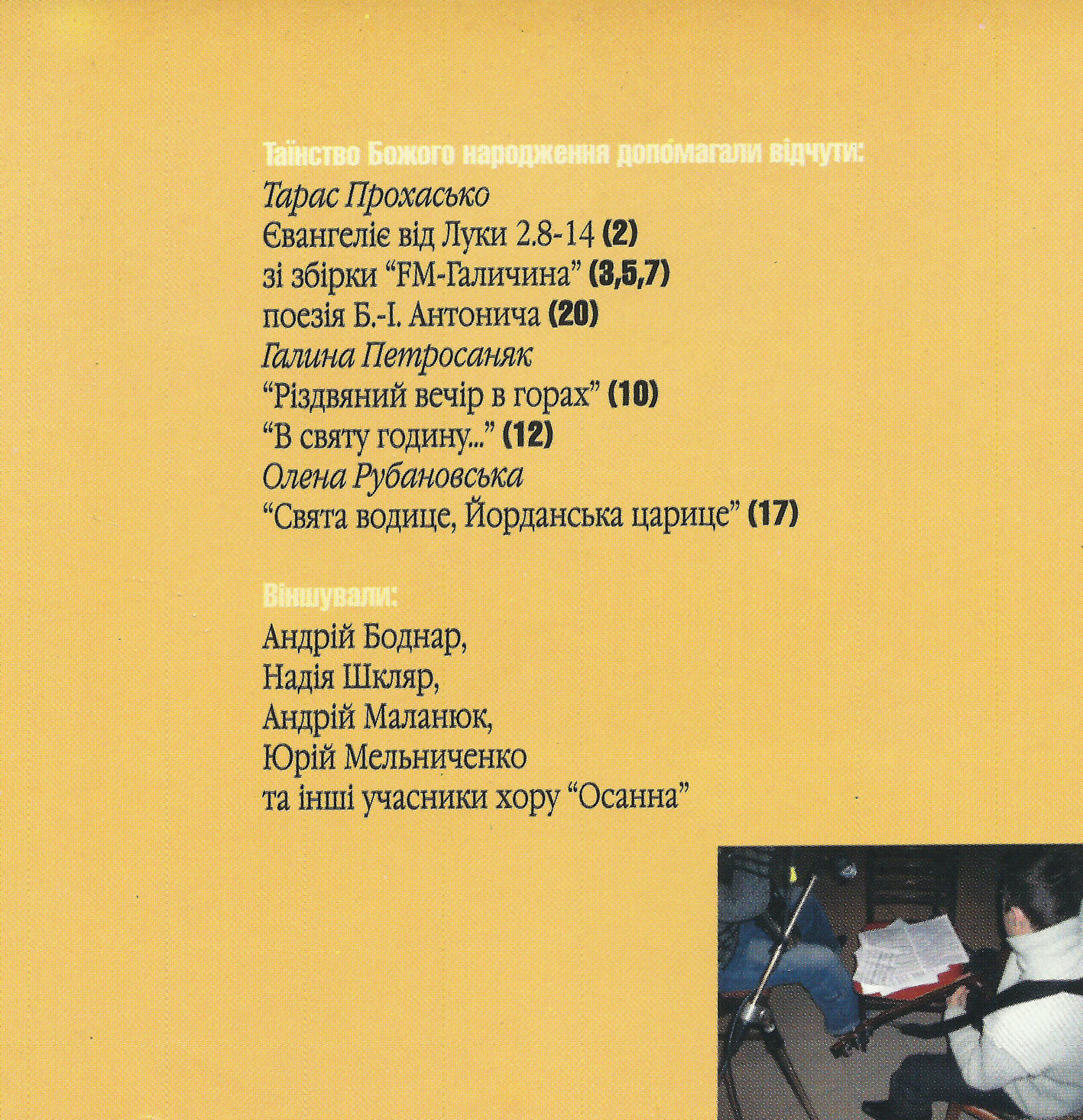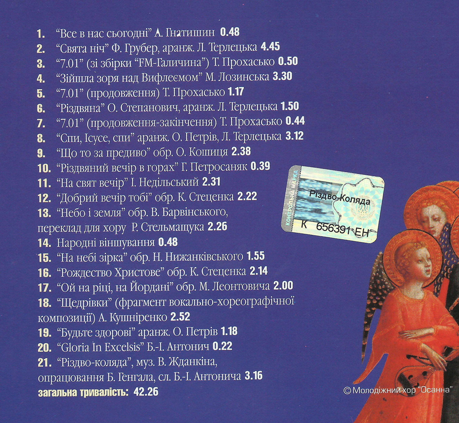 1. Все в нас сьогодні (flac, 4 Мб) 2. Свята ніч (flac, 26 Мб) 3. 7.01 (flac, 3 Мб) 4. Зійшла зоря над Вифлеємом (flac, 18 Мб) 5. 7.01 (продовження) (flac, 5 Мб) 6. Різдвяна (flac, 10 Мб) 7. 7.01 (продовження-закінчення) (flac, 3 Мб) 8. Спи, Ісусе, спи (flac, 16 Мб) 9. Що то за предиво (flac, 12 Мб) 10. Різдвяний вечір в горах (flac, 2 Мб) 11. На свят вечір (flac, 12 Мб) 12. Добрий вечір тобі (flac, 13 Мб) 13. Небо і земля (flac, 13 Мб) 14. Народні віншування (flac, 3 Мб) 15. На небі зірка (flac, 10 Мб) 16. Рождество Христове (flac, 12 Мб) 17. Ой на ріці, на Йордані (flac, 10 Мб) 18. Щедрівки (flac, 13 Мб) 19. Будьте здорові (flac, 7 Мб) 20. Gloria In Excelsis (flac, 1 Мб) 21. Різдво-коляда (flac, 19 Мб)